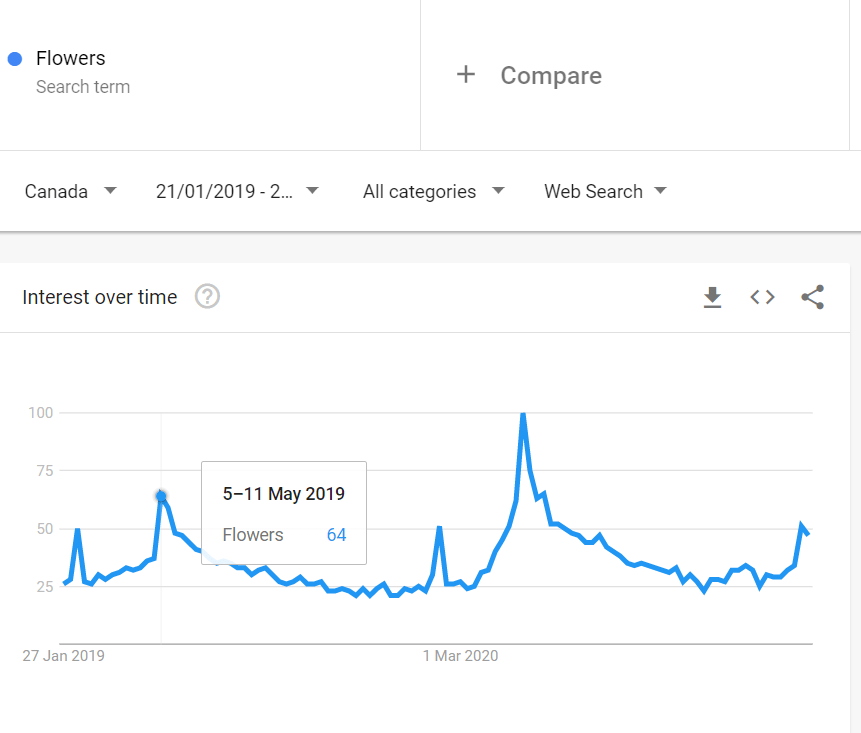 Below is a sample of what seasonal patterns could look like searching “flowers.” Note the spikes for Mothers Day and Valentines Day.
