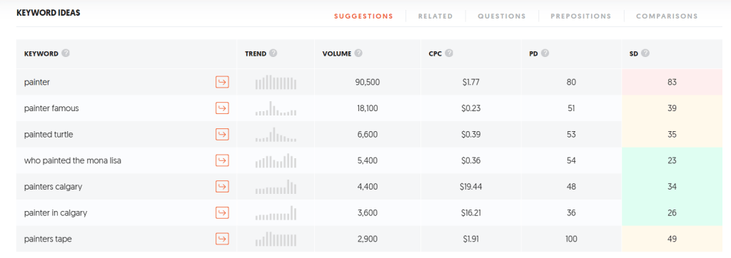 UberSelect.com Searching for “painter,” we can see below that the volume is 90,500 per month, the CPC cost per click is $1.77, PD paid difficulty is 80, and SD search difficulty is 83.