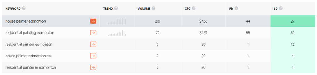 Paid Difficulty: Refers to the difficulty of ranking high in search results. The lower the number, the easier it is to earn the top paid spot. “Painter” has a difficulty of 80, meaning there may be many bidders for that paid term. 44 indicates that “house painters in Edmonton” is moderately competitive.