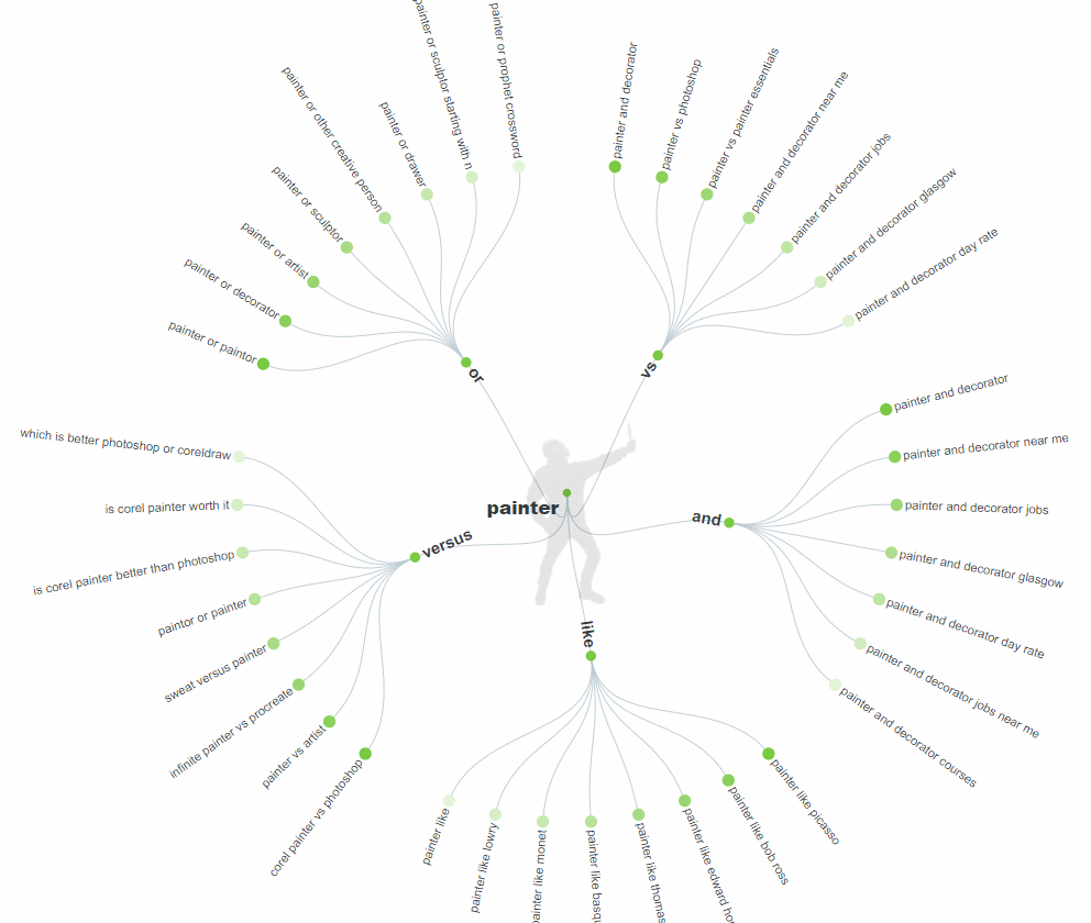 Below, using “painter” in AnswerThePublic.com is a sample of the infographics on each search. Darker green indicates higher search volumes. You can see that “painter and decorator” was a common keyword search, along with a comparison of Corel Painter and Photoshop. This might be an excellent idea for more content on your site. (Keyword metrics, Vol 210, $5.60 CPC, 20 SD)
