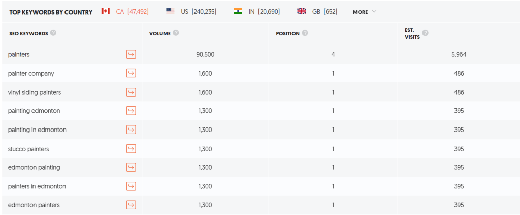 Below is a sample analysis of a company with a high SERP ranking for “house painters Edmonton.” As you can see, “painter” is one of the keywords that it ranks for. However, the second-highest phrase, “painter company,” is providing a large volume as well as “painter Edmonton.” These could be keywords to consider for your content. As a special note, even if this domain paid for the “painters” keyword, they are not getting 100% of the search volume. This is consistent across all the keywords.