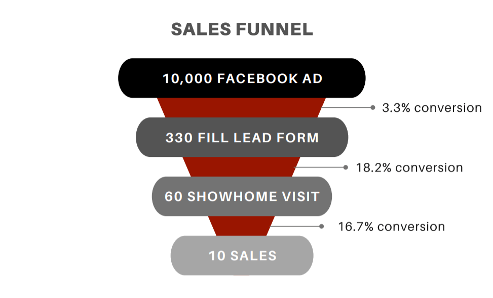 Using these past results, an estimate can be created for ALL marketing efforts. If the campaign drives 10,000 customers to your Facebook page, you can estimate to expect 10 sales. If the campaign is estimating 30 showhome visits, 4 sales can be estimated.